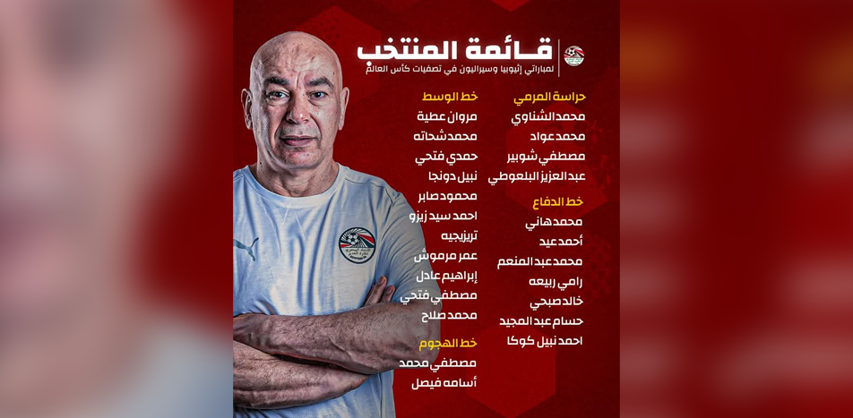 أعلن المدير الفني لمنتخب مصر، كابتن حسام حسن، اليوم قائمة الفراعنة لمواجهتي إثيوبيا في 21 مارس وسيراليون في 25 مارس الجاري.