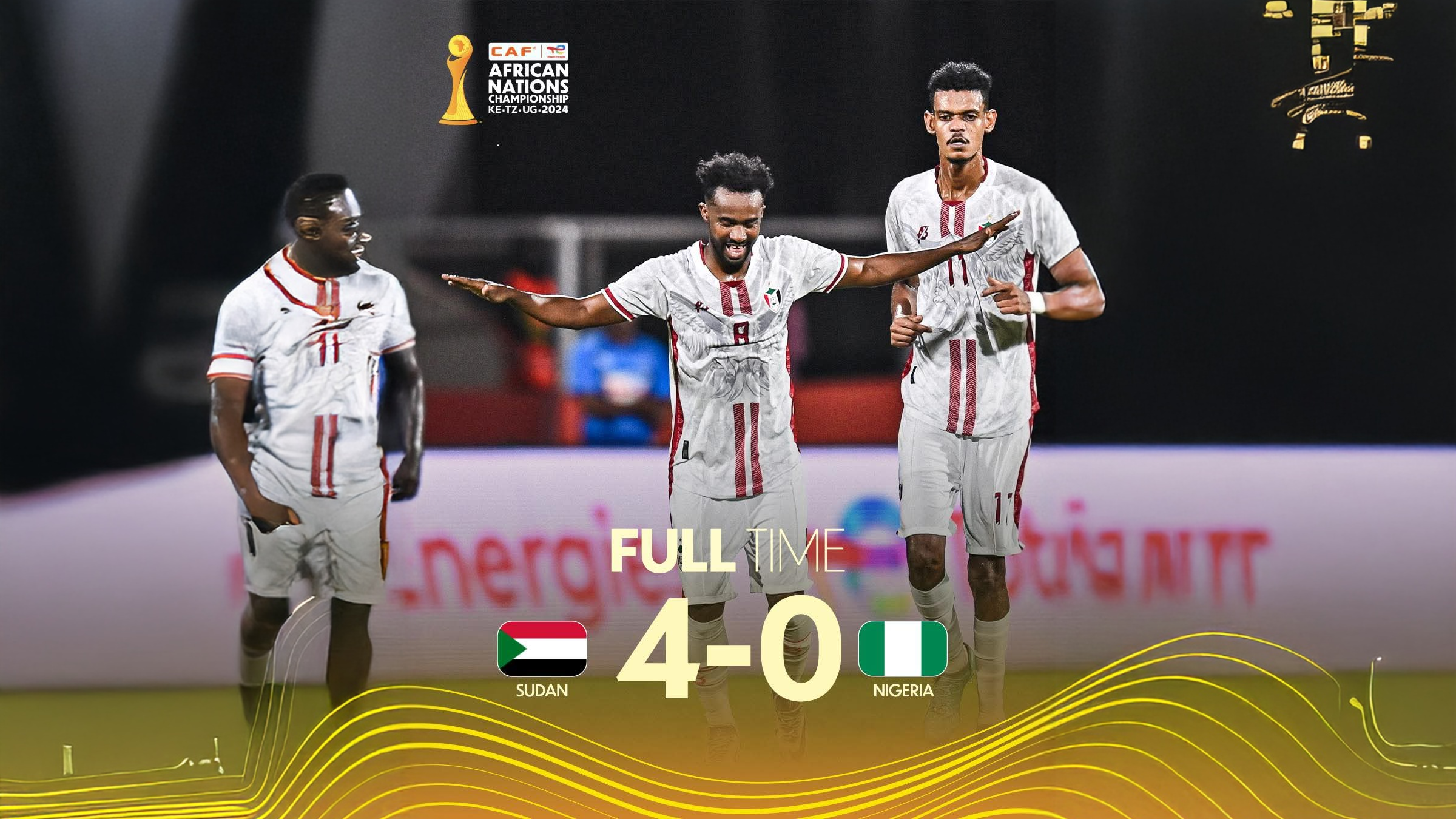 رباعية السودان افتتحها مدافع نيجيريا نبينغي في مرماه بالشوط الأول، قبل أن يتسبب في مطلع الشوط الثاني ذات اللاعب بركلة جزاء أضاف منها قائد الصقور بوغبا الهدف الثاني، ليسجل نجم المباراة روفا الهدف الثالث، قبل أن يختتم روفا بأجمل الأهداف الرابع في قلب المرمى.