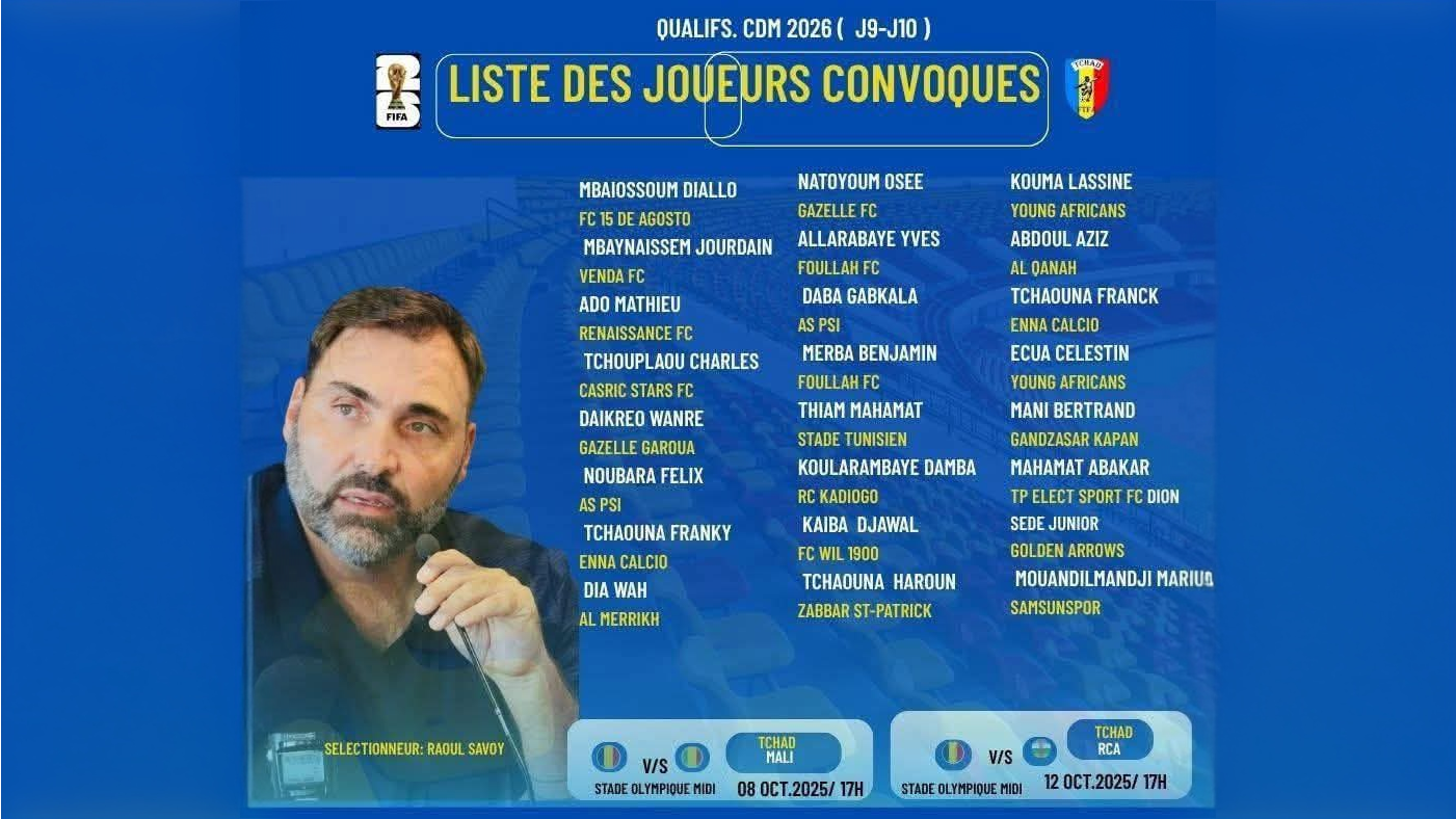 أعلن المدرب السويسري راؤول سافوي عن قائمة منتخب “تشاد” لمواجهتي مالي وجمهورية أفريقيا الوسطى في التصفيات الأفريقية المؤهلة لمونديال أمريكا وكندا والمكسيك 2026.