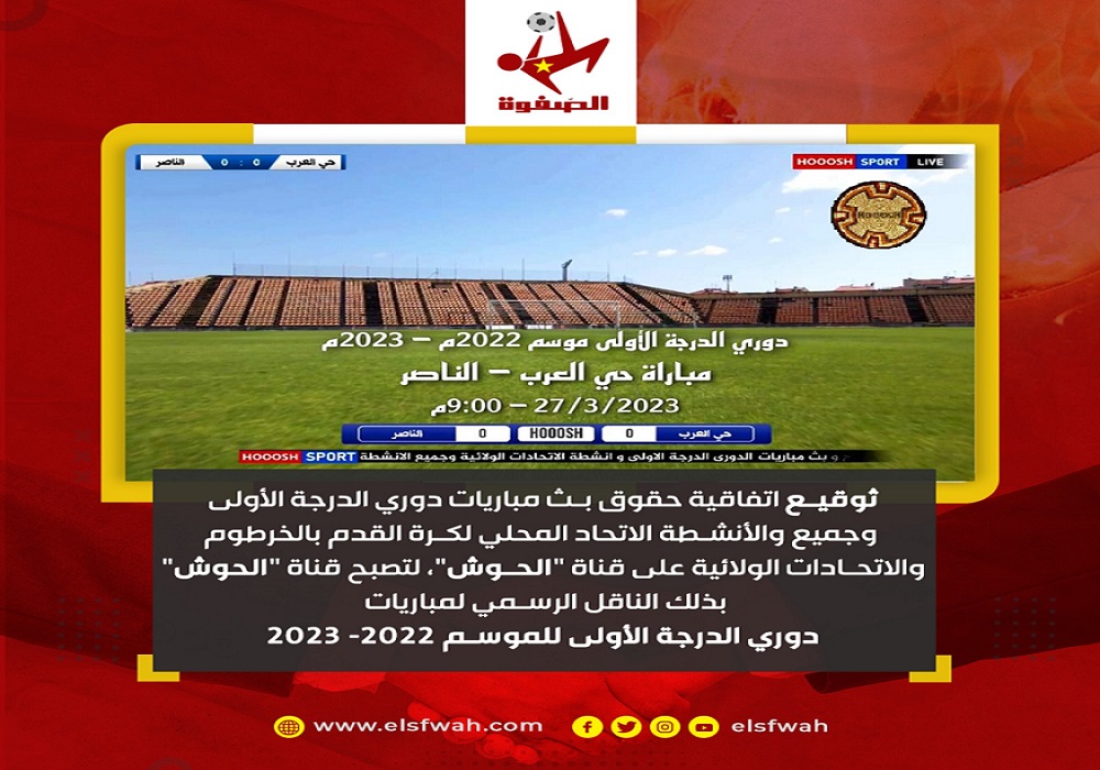 تم الإعلان عن توقيع اتفاقية حقوق بث مباريات دوري الدرجة الأولى، وجميع والأنشطة الاتحاد المحلي لكرة القدم بالخرطوم والاتحادات الولائية على قناة “الحوش”، لتصبح قناة “الحوش” بذلك الناقل الرسمي لمباريات دوري الدرجة الأولى للموسم 2022- 2023، وكافة أنشطة الاتحاد المحلي بالخرطوم والاتحادات الولائية لكرة القدم.