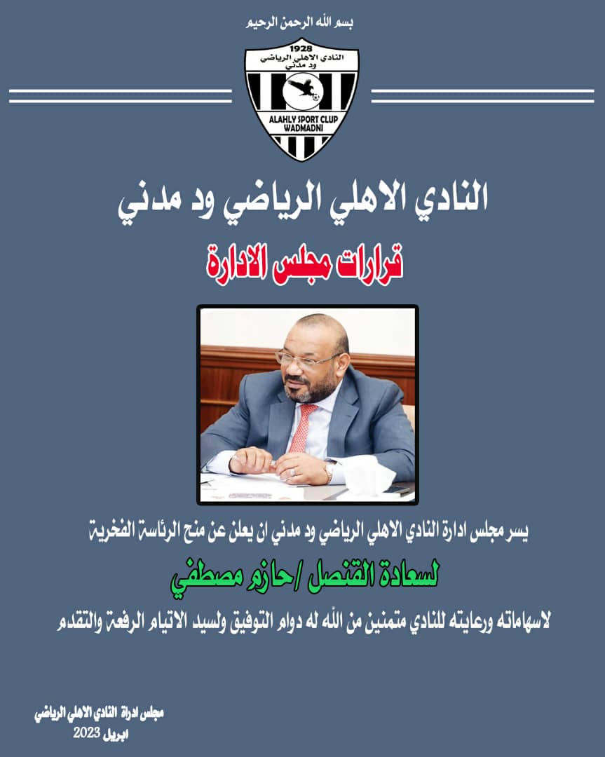 أصدر مجلس إدارة النادي الأهلي مدني، قرارًا يقضي بمنح القنصل حازم مصطفى الرئاسة الفخرية للنادي، نظرًا لإسهاماته ورعايته للنادي الأهلي ود مدني، وعبر مجلس إدارة النادي الأهلي ود مدني، عن سعادتهم برعاية القنصل حازم مصطفى لناديهم، وتكريمًا لعطائه الكبير قرر المجلس منحه الرئاسة الفخرية للنادي، متمنين له دوام التوفيق والسداد ولسيد الأتيام الرفعة والتقدم.