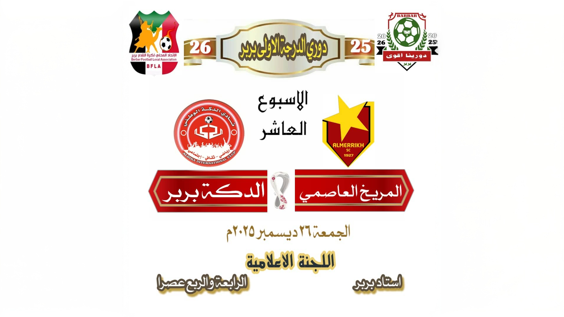 يواجه المريخ B في الرابعة والربع عصر اليوم بإستاد بربر فريق الدِكّة ضمن مباريات الأسبوع العاشر لدوري الدرجة الأولى بالمدينة .