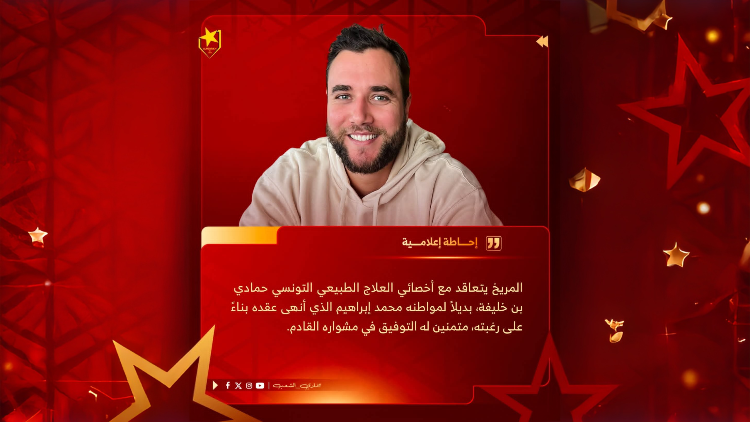تعاقد نادي المريخ مع أخصائي العلاج الطبيعي التونسي حمّادي بن خليفة ، خلفاً لمواطنه محمد إبراهيم ، الذي أبدي رغبته في إنهاء عمله مع الفريق ، متمنين له التوفيق في مشواره القادم.