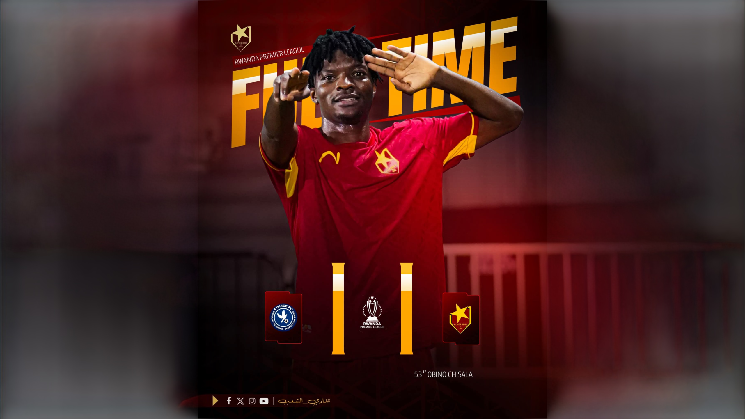 نجح المريخ في إدراك التعادل مع البوليس متصدر الدوري الرواندي بهدف لكل في قمة مباريات الاسبوع باستاد كيجالي ييليه ليرفع رصيده الى 29 نقطة فيما البوليس ب 33 نقطة .